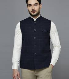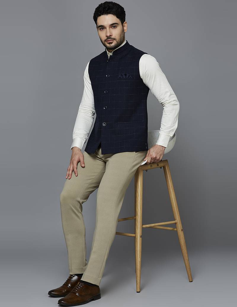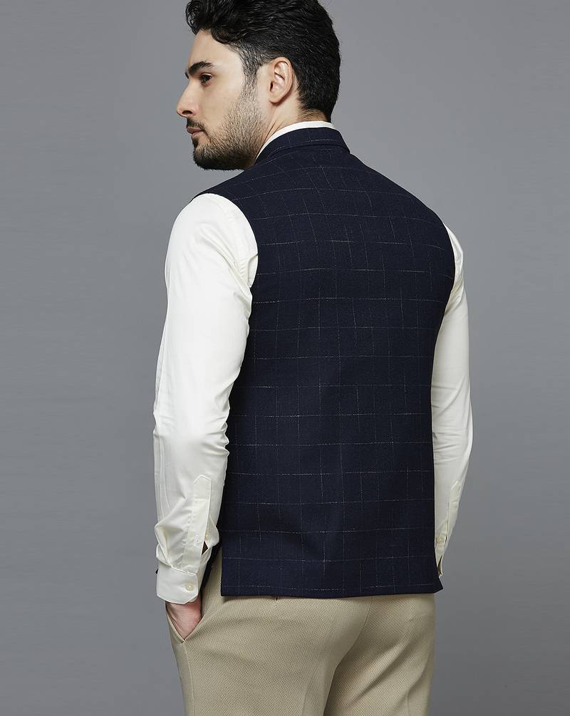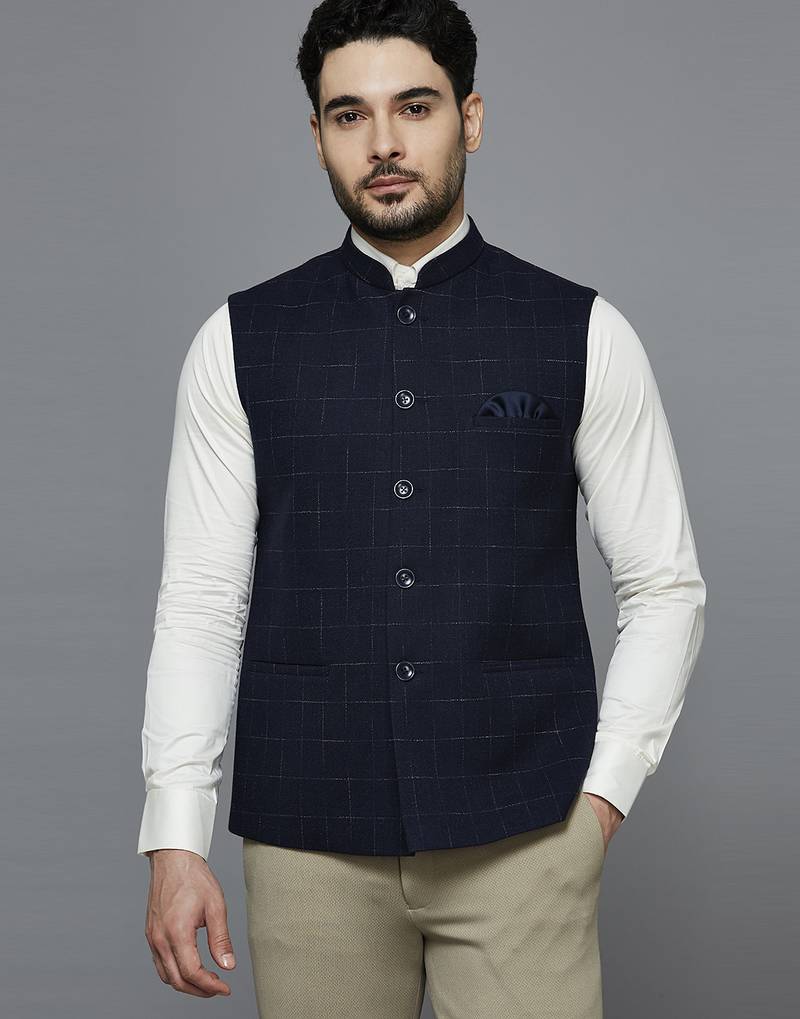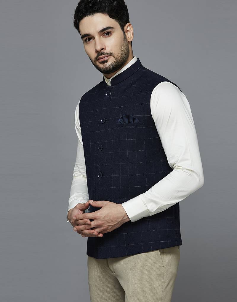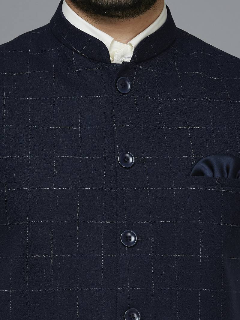 | Product Description | Navy Blue Nehru Jacket With Self Yellow Chex, Comes With A Mandarin Collar (Bandhgala), Straight Button Placket, 3 Welt Pockets And A Pocket Square. |