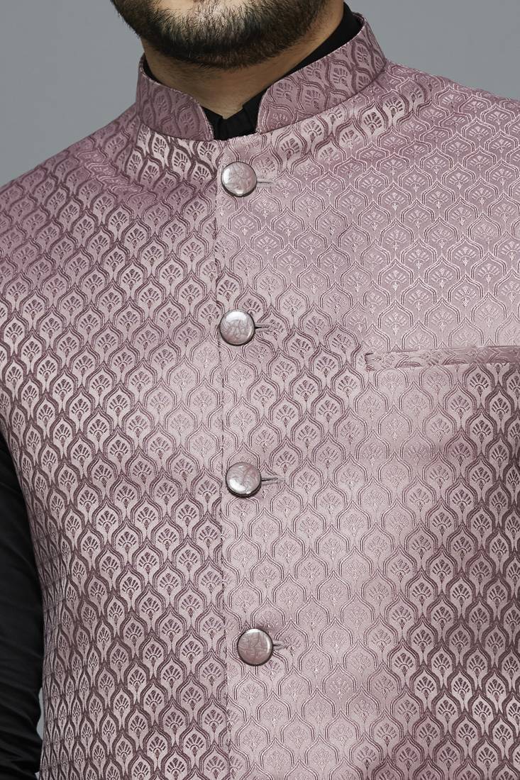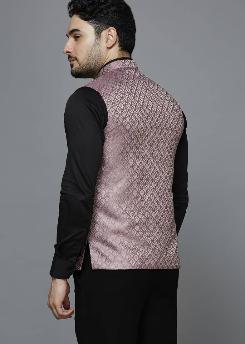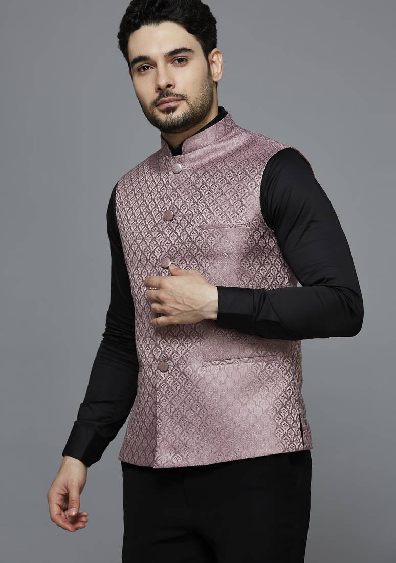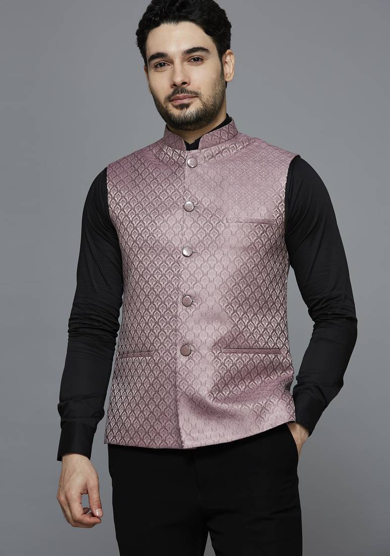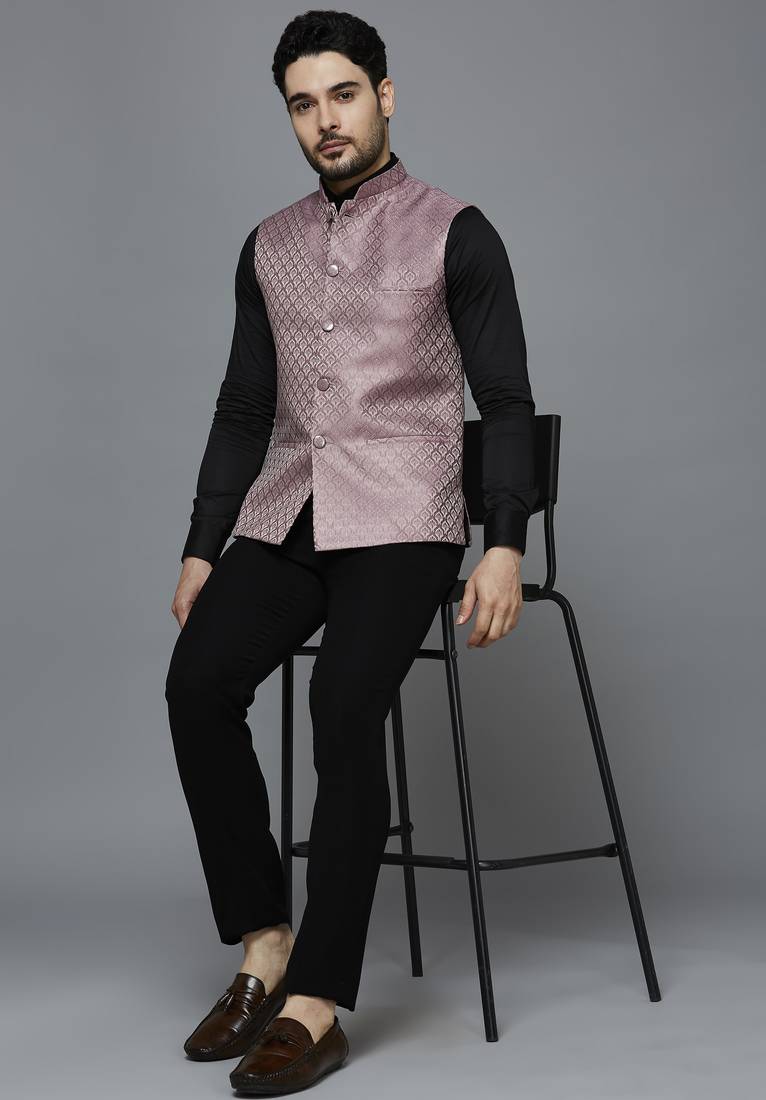 | Product Description | Pink Ethnic Motif Jacquard Nehru Jacket, Comes With A Mandarin Collar (Bandhgala), Straight Button Placket, And 3 Welt Pockets. |