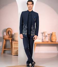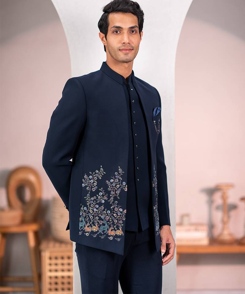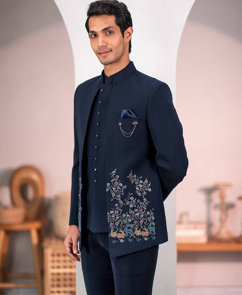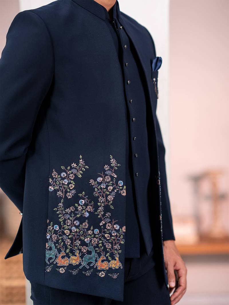| Product Name | Navy Blue Jodhpuri Suit With Forest Scenic Rubber Print And Hand Embroidery | |