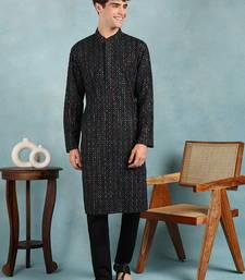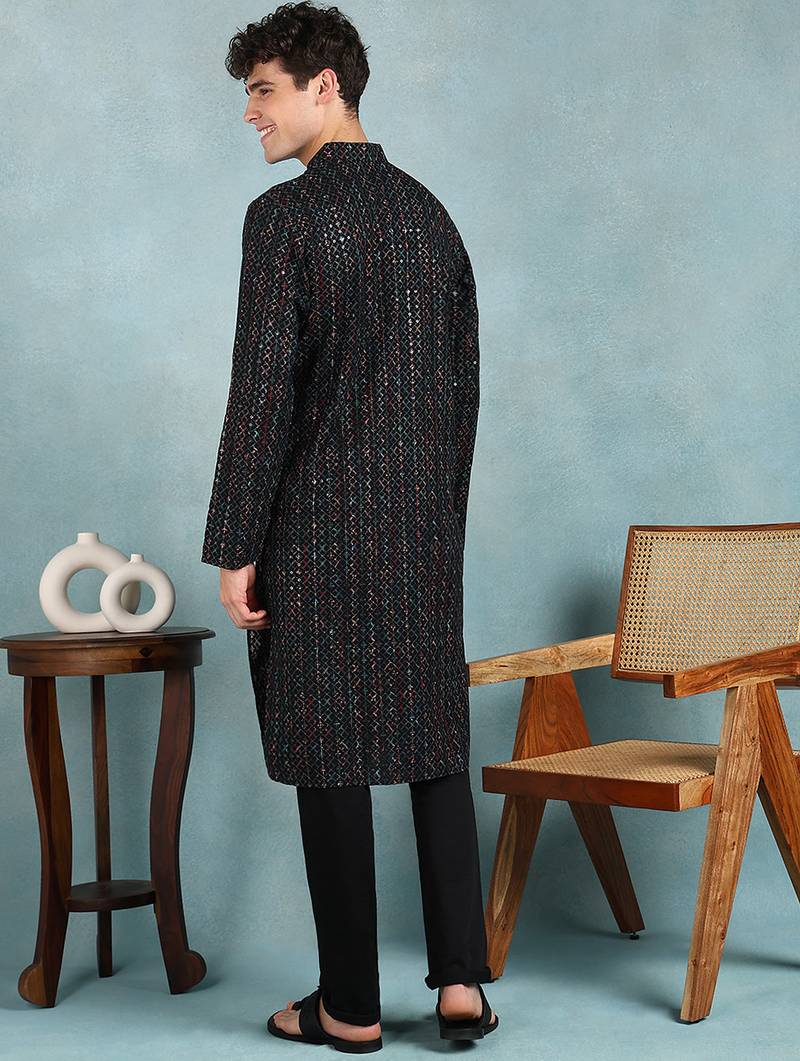 Men black viscose rayon ethnic motifs embroidered straight kurta