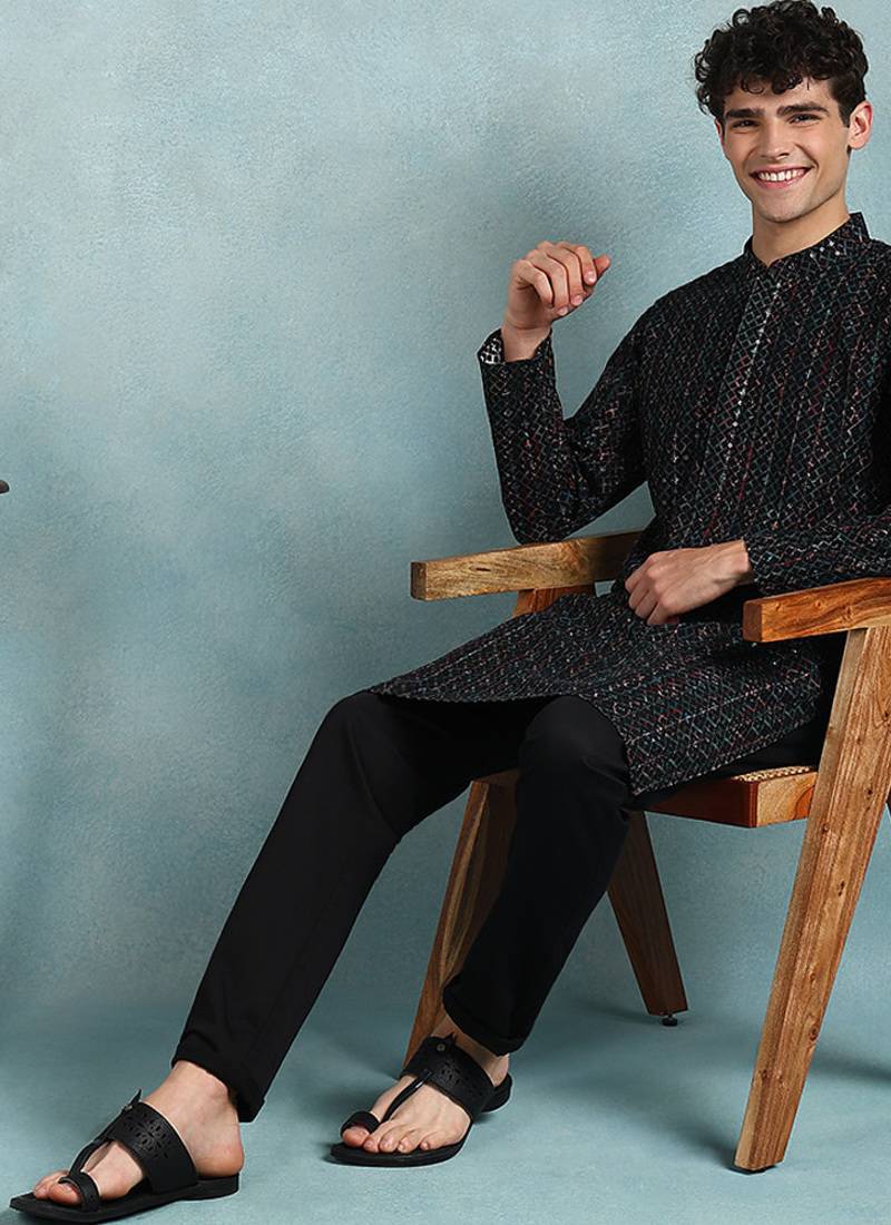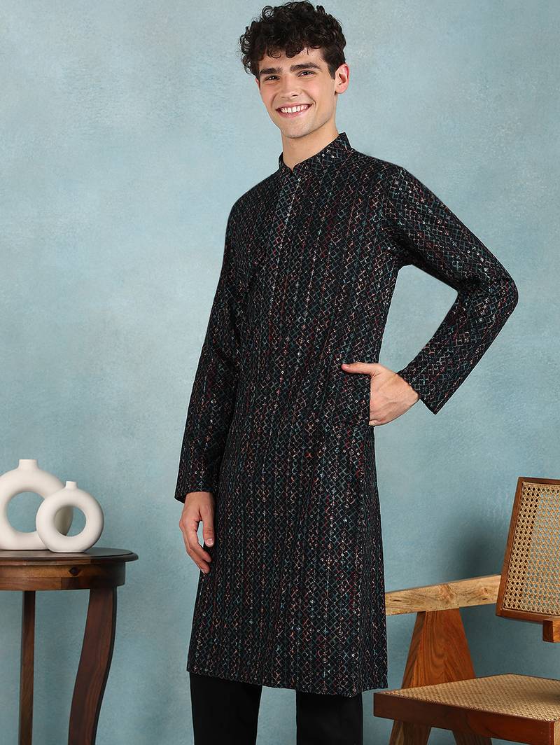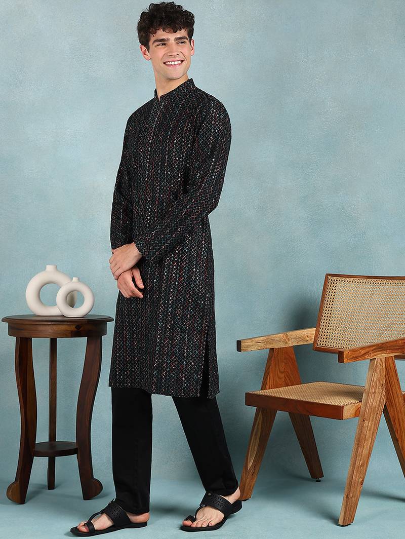 | Product Name | Men Black Viscose Rayon Ethnic Motifs Embroidered Straight Kurta | |