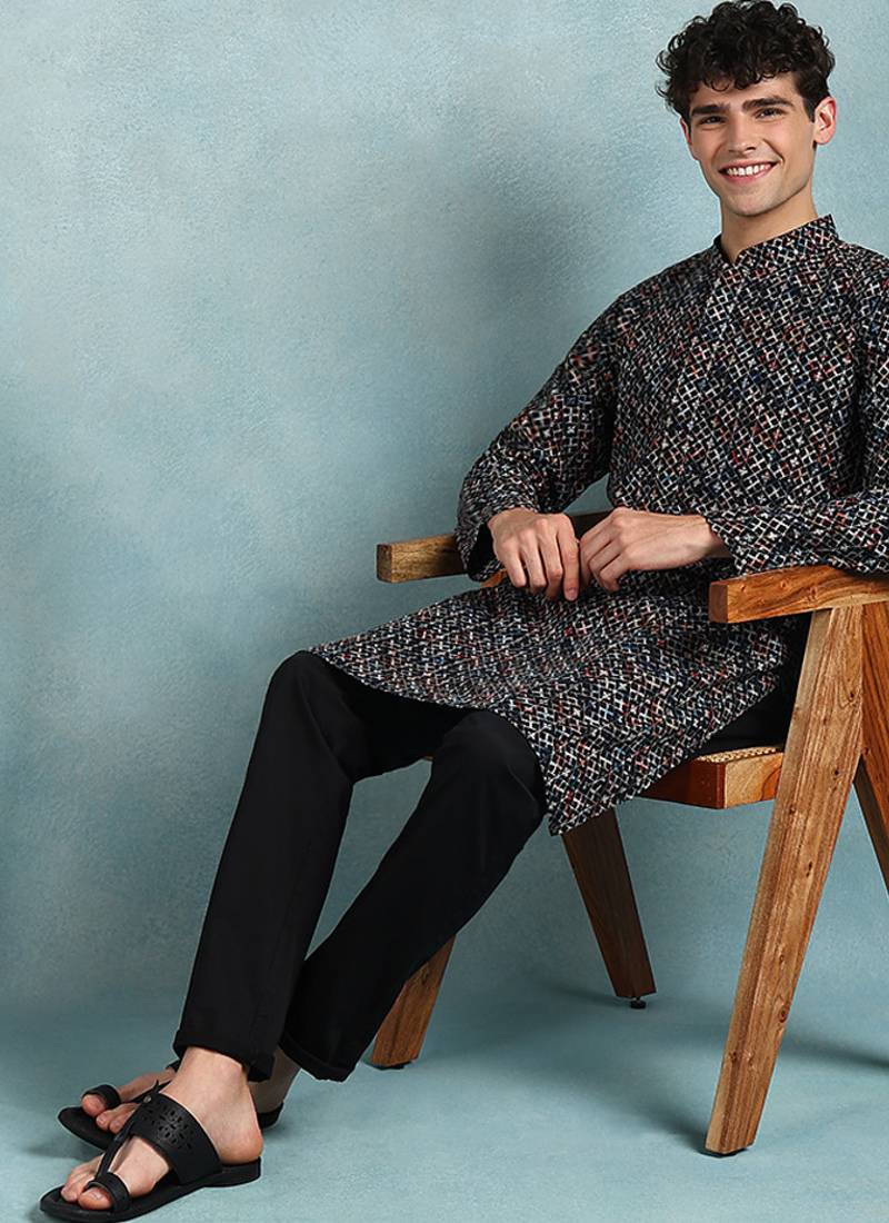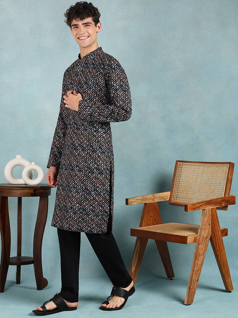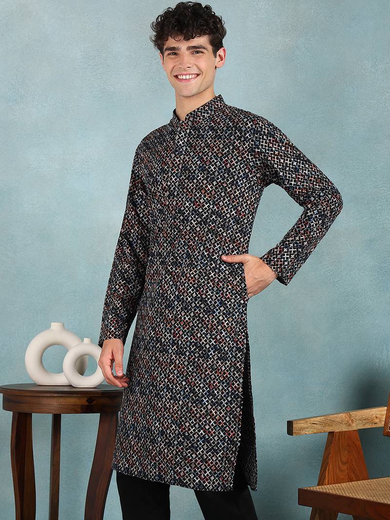 | Product Name | Men Black Viscose Rayon Ethnic Motifs Embroidered Straight Kurta | |