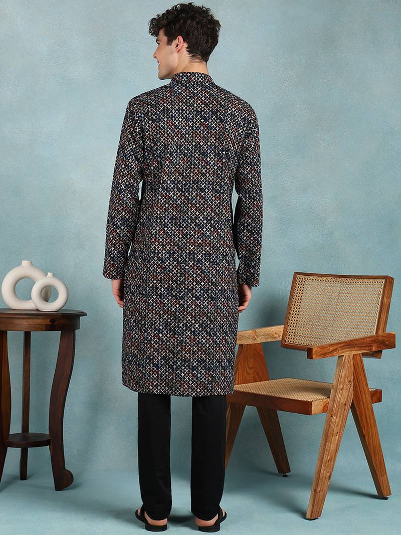 Men black viscose rayon ethnic motifs embroidered straight kurta
