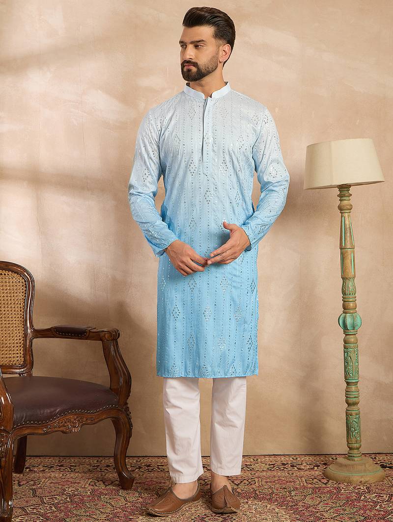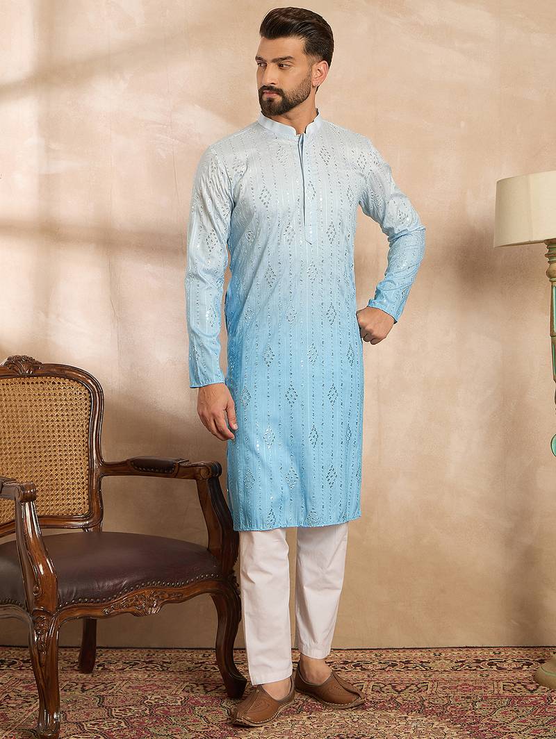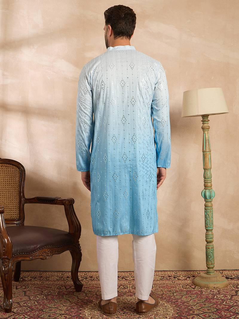 | Product Name | Men Blue Silk Blend Ombre Embroidered Straight Kurta Sets | |