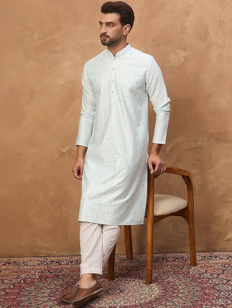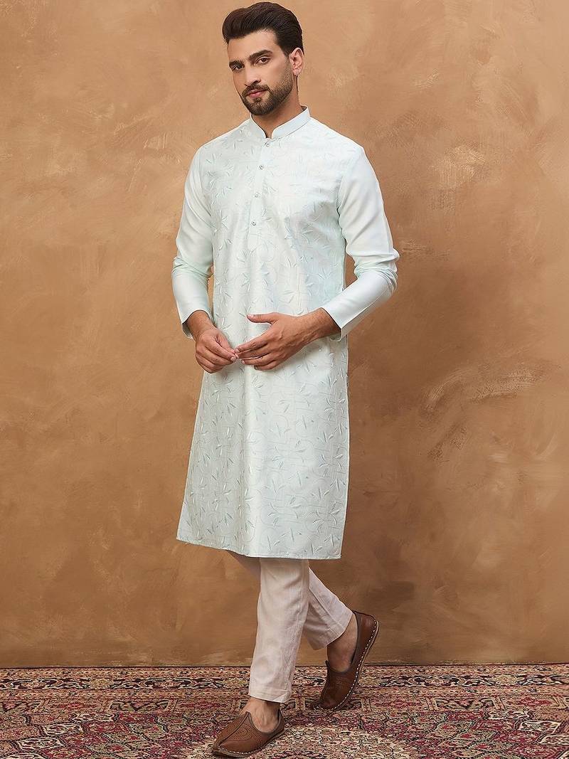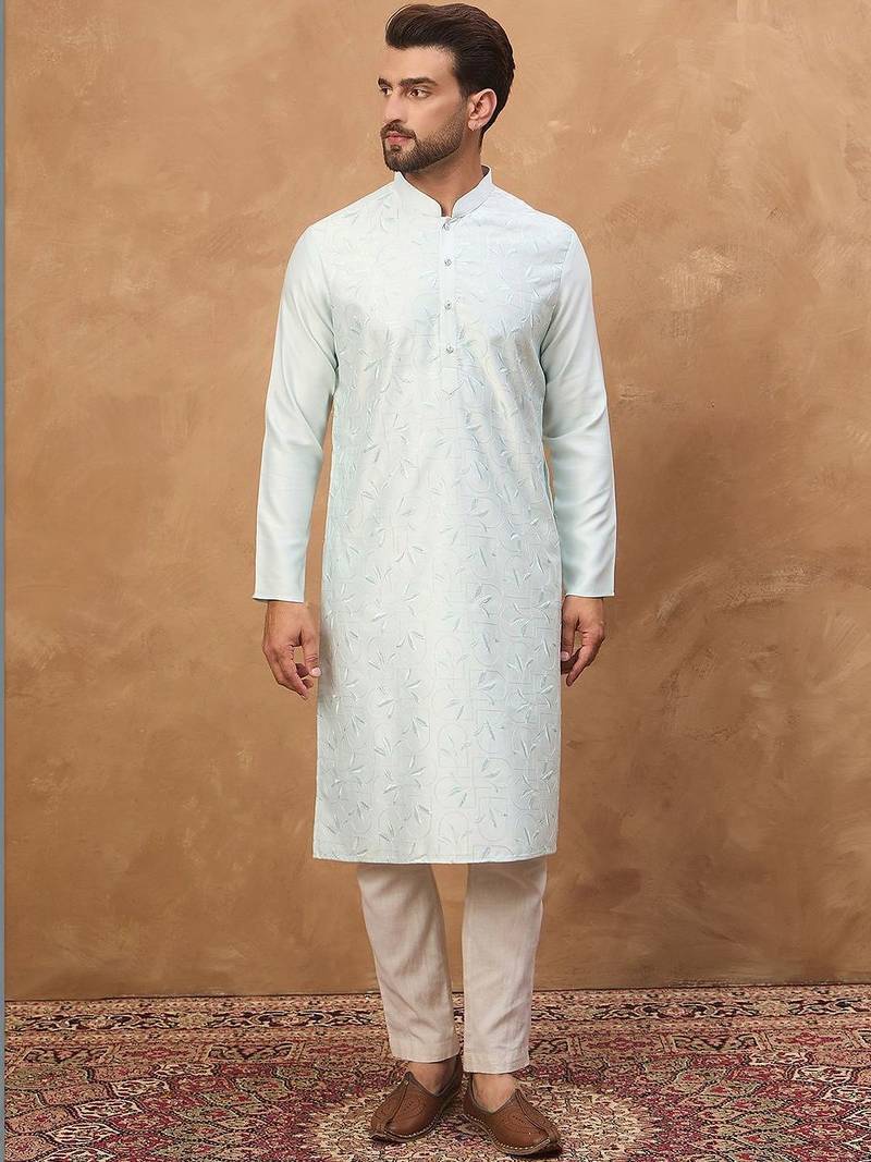 | Product Name | Men Blue Silk Blend Solid Embroidered Straight Kurta With Pant Set | |
