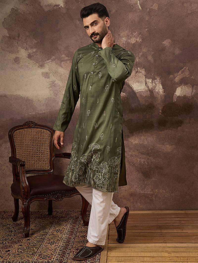 | Product Name | Men Green Silk Blend Solid Embroidered Straight Kurta And Trouser | |