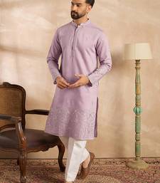 Men lavender silk blend floral embroidered straight kurta