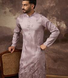 Men lavender silk blend solid embroidered straight kurta