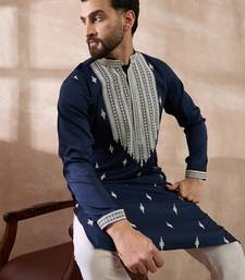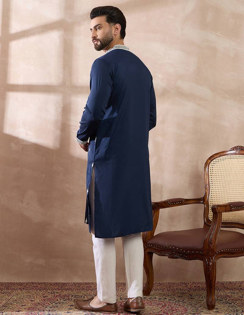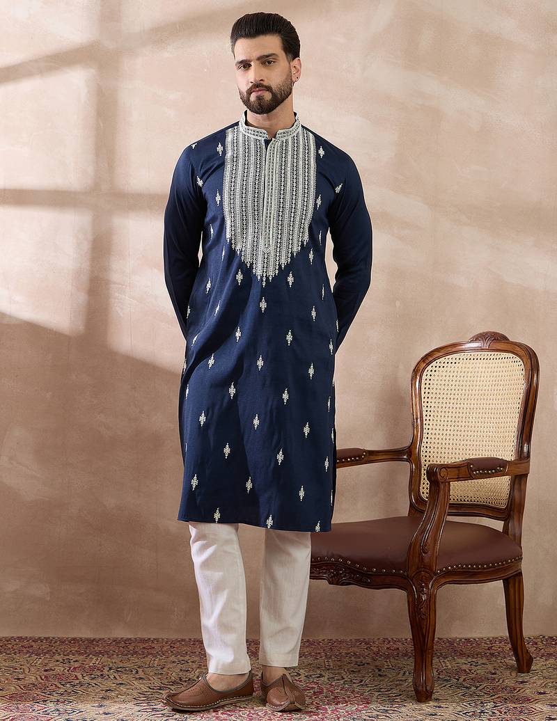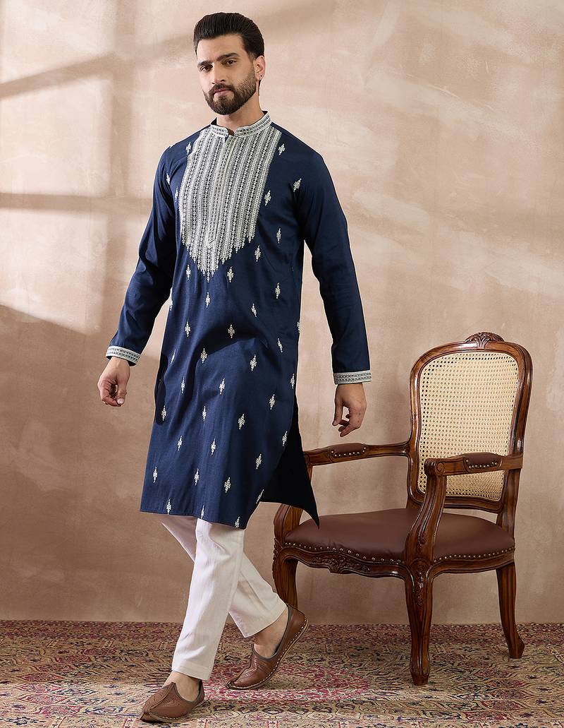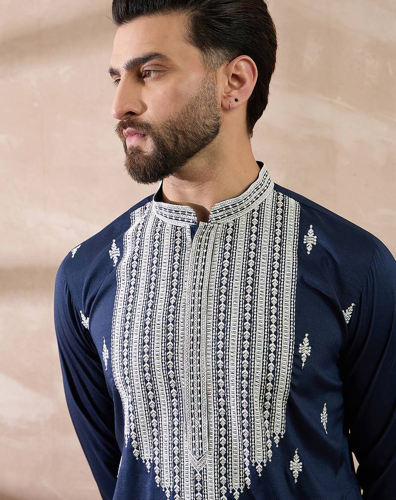 | Product Name | Men Navy Blue Silk Blend Embroidered Mandarin Collar Straight Kurta With Trouser | |