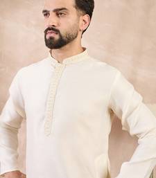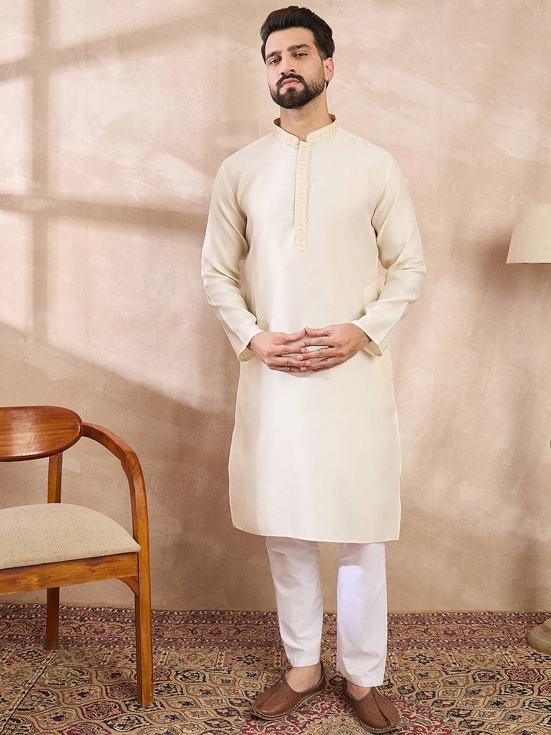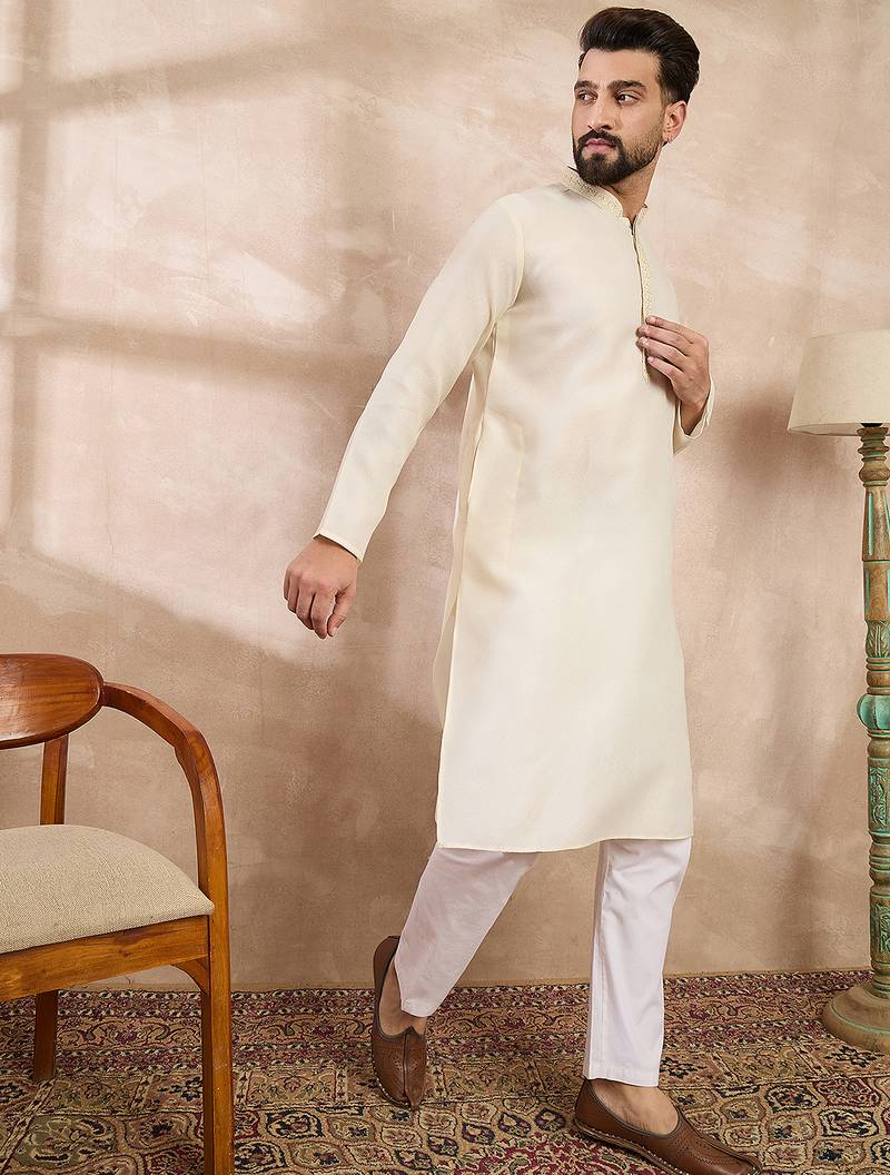 Men off white silk blend solid embroidered straight kurta with trouser