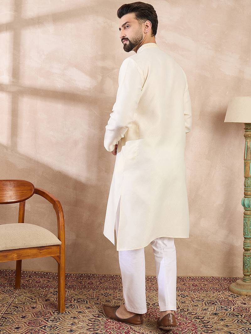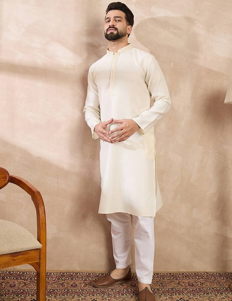 | Product Name | Men Off White Silk Blend Solid Embroidered Straight Kurta With Trouser | |