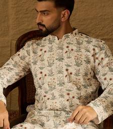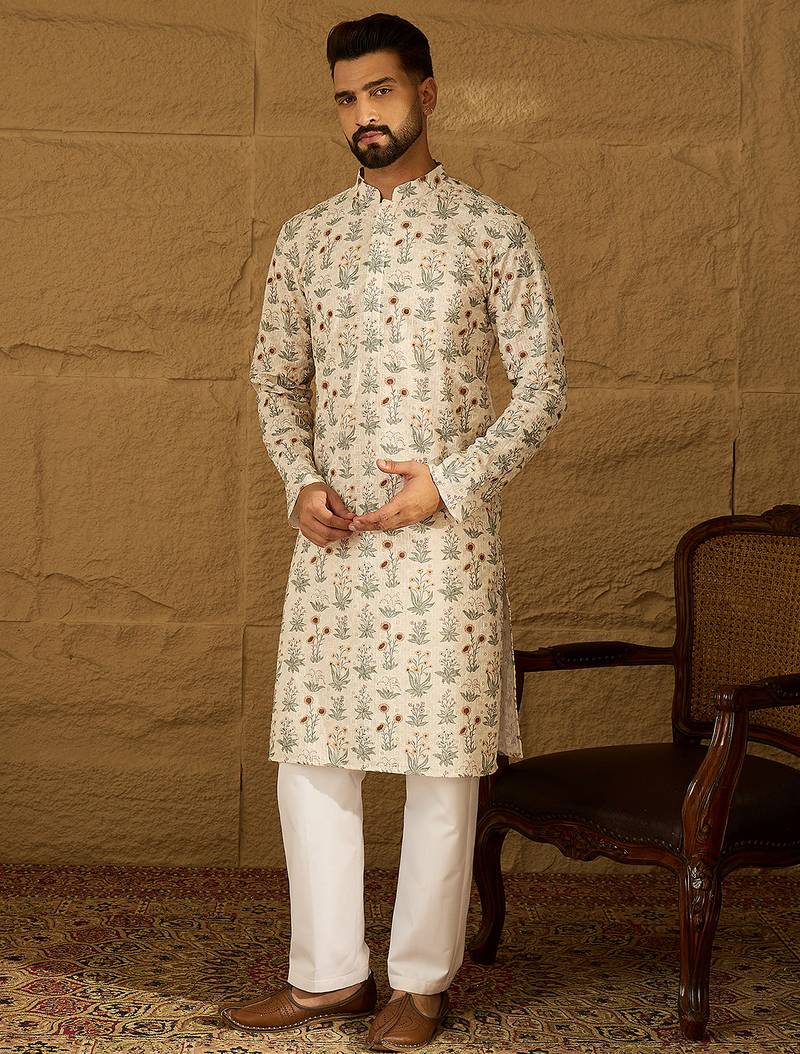 Men off white viscose rayon floral printed straight kurta