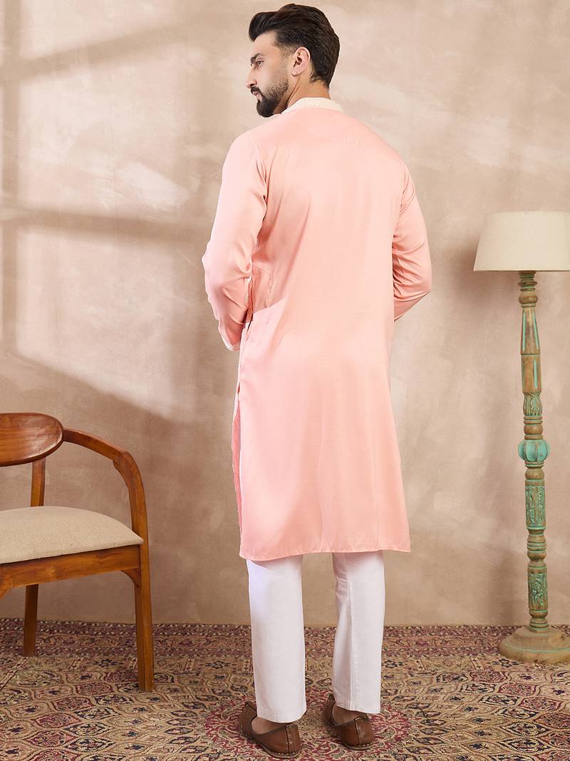 | Product Name | Men Pink Silk Blend Ethnic Motifs Embroidered Straight Kurta With Trouser | |