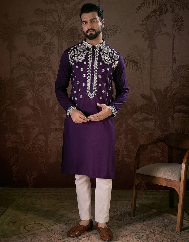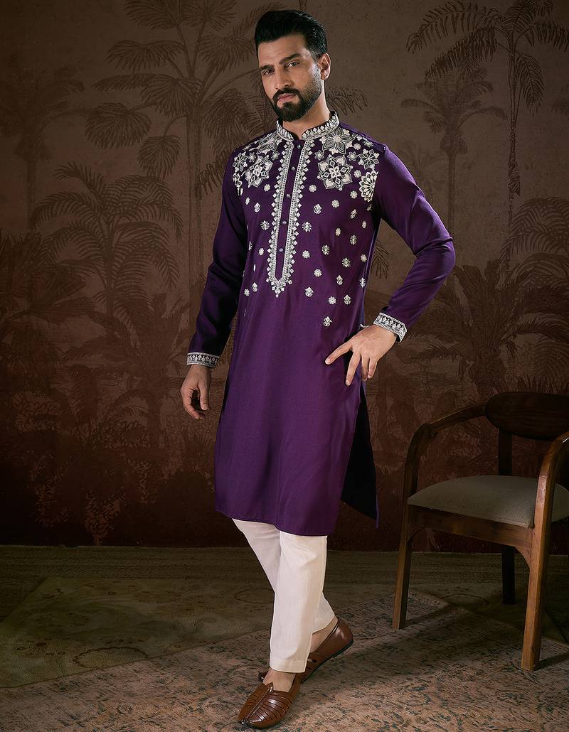 | Product Name | Men Purple Silk Blend Solid Embroidered Straight Kurta With Trouser | |