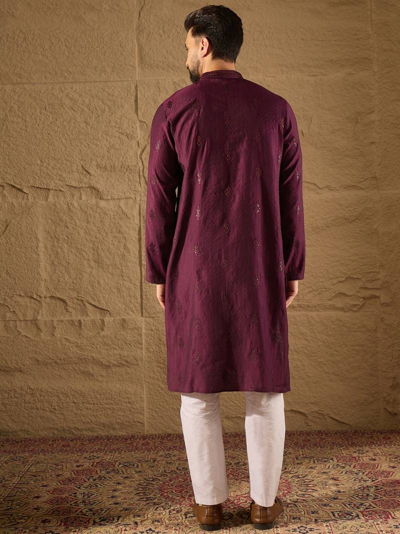 Men purple viscose rayon solid embroidered straight kurta