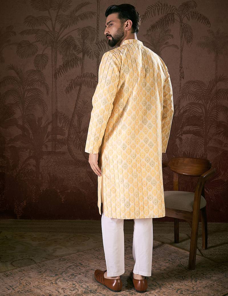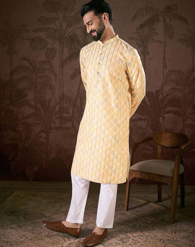 | Product Name | Men White Silk Blend Ethnic Motifs Printed Straight Kurta With Trouser | |