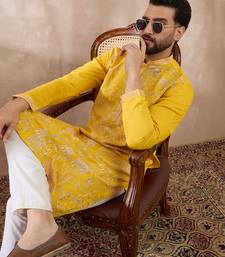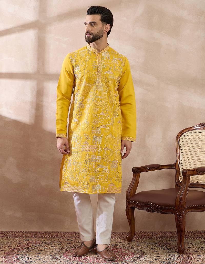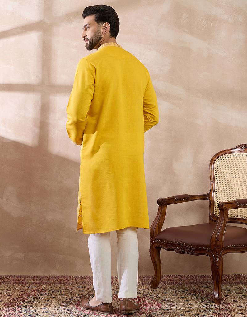 | Product Name | Men Yellow Silk Blend Embroidered Mandarin Collar Straight Kurta With Trouser | |