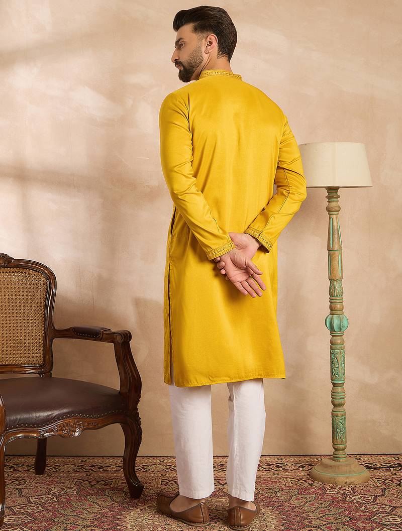 | Product Name | Men Yellow Silk Blend Geometric Embroidered Straight Kurta Sets | |