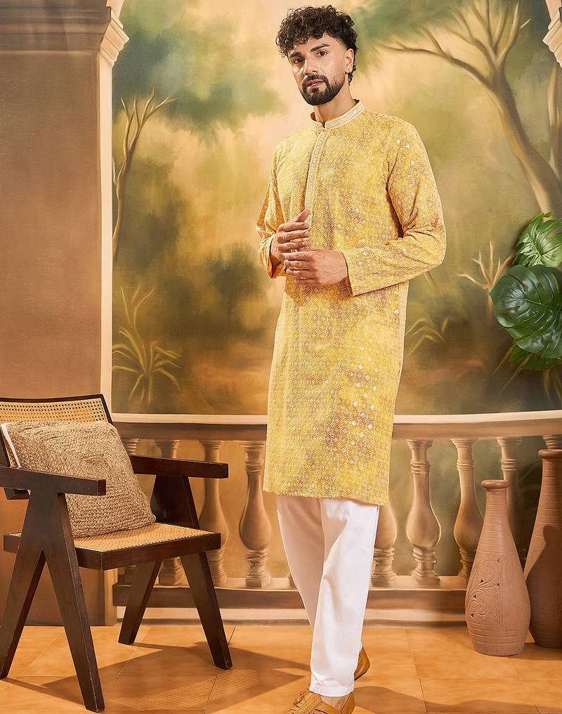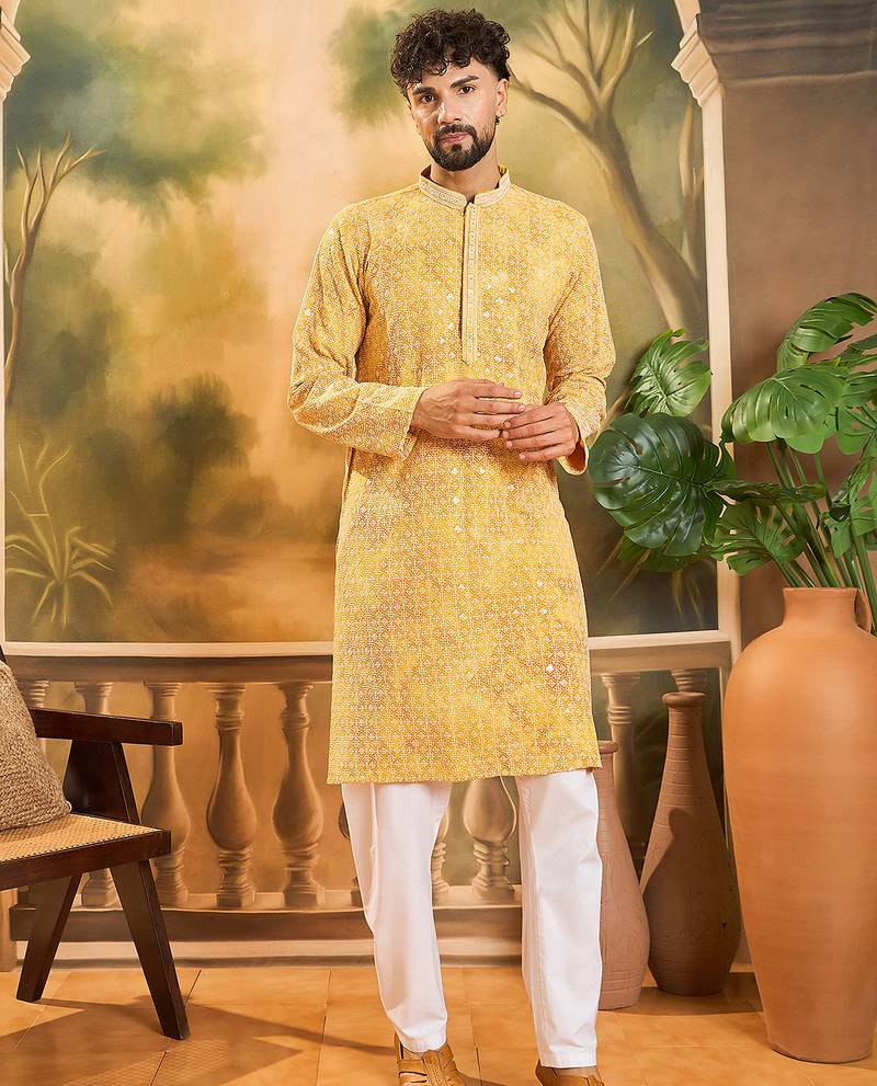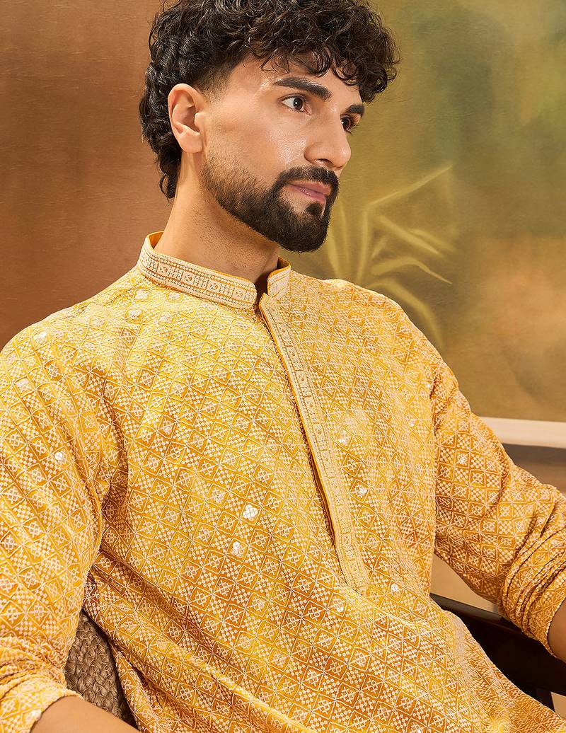 | Product Name | Men Yellow Viscose Rayon Shibori Embroidered Straight Kurta With Trouser | |