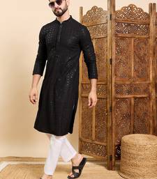 Mens black viscose rayon solid embroidered ethnic straight sequins kurta