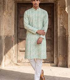 Mens green cotton blend chevron embroidered kurta with trouser