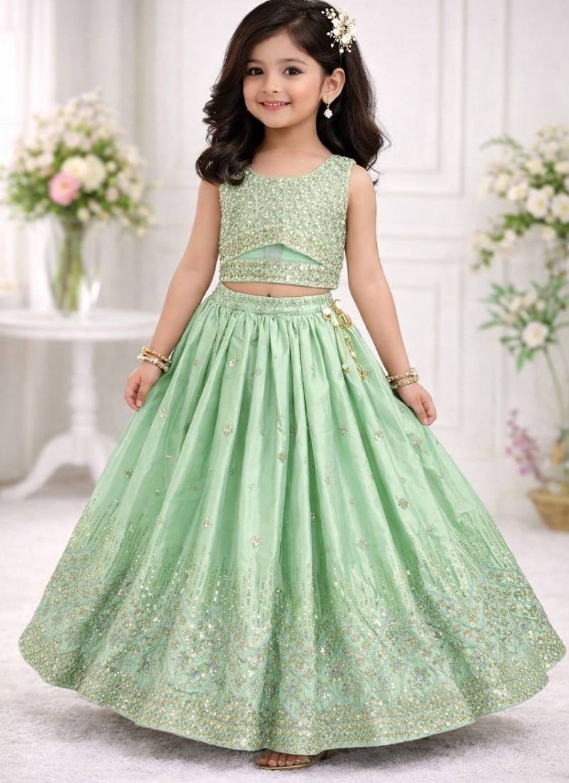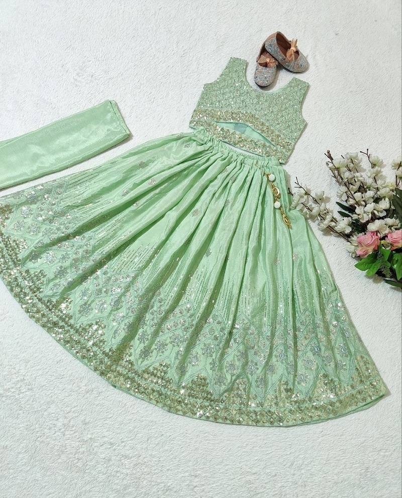 | Product Name | Pista Chinon Silk Embroidered Work Wedding Kids Lehenga Choli | |