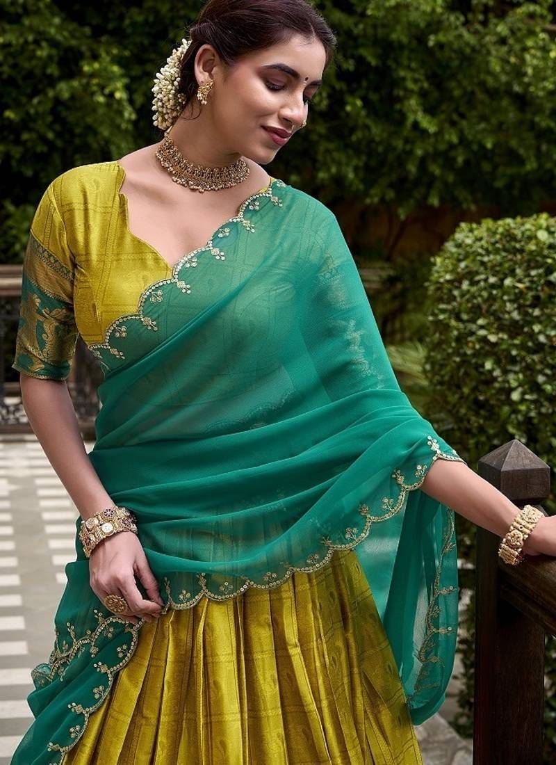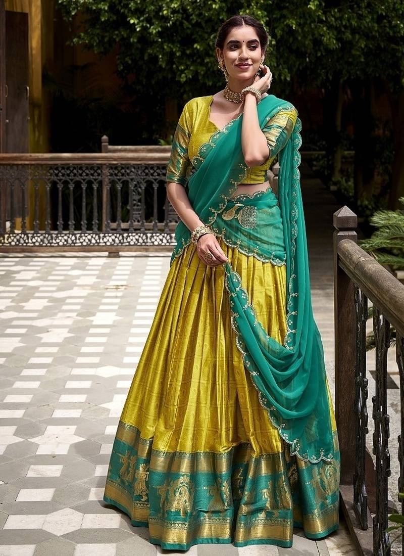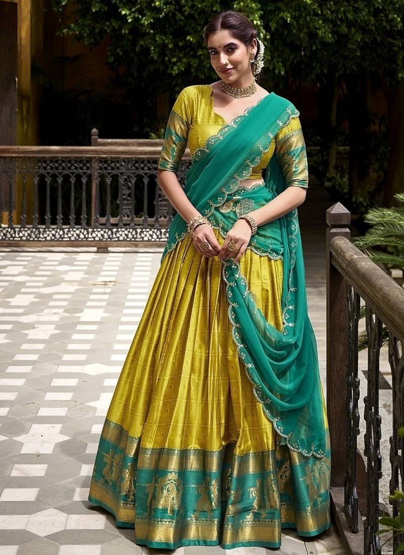 Traditional yellow poly cotton half saree with zari weaving work lehenga choli