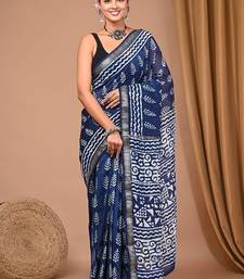 Blue maheshwari silk saree with woven borders and beautiful hand block print