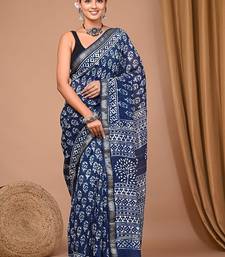 Blue maheshwari silk saree with woven borders and beautiful hand block print