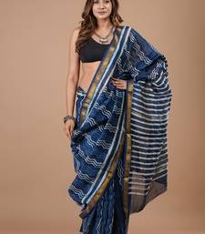 Blue maheshwari silk saree with woven borders and beautiful hand block print