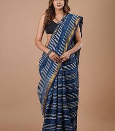Blue maheshwari silk saree with woven borders and beautiful hand block print