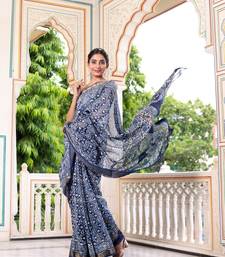Blue maheshwari silk saree with woven borders and beautiful hand block print