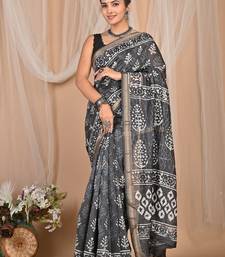 Grey maheshwari silk saree with woven borders and beautiful hand block print