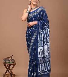 Navy blue soft mul cotton saree with unstiched attached blouse piece