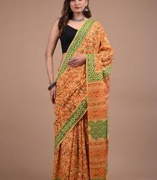 Product Name Orange Cotton Hand Block Printed Mulmul Sarees With Attach Printed Blouse