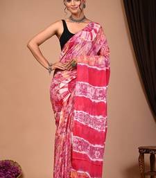 Pink cotton hand block printed mulmul sarees with attach printed blouse
