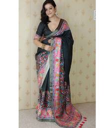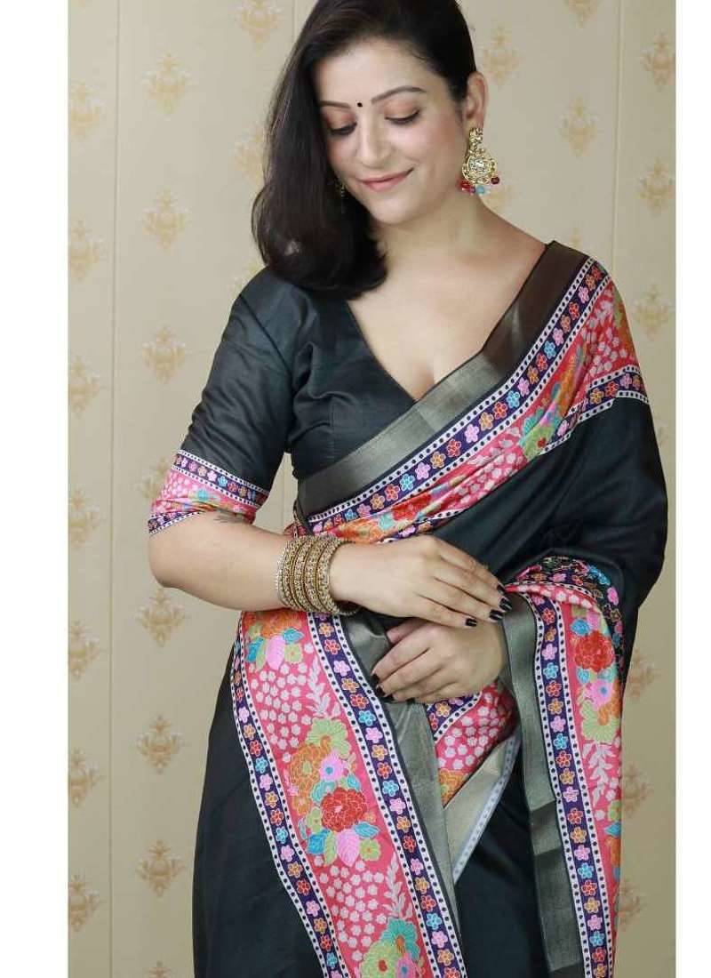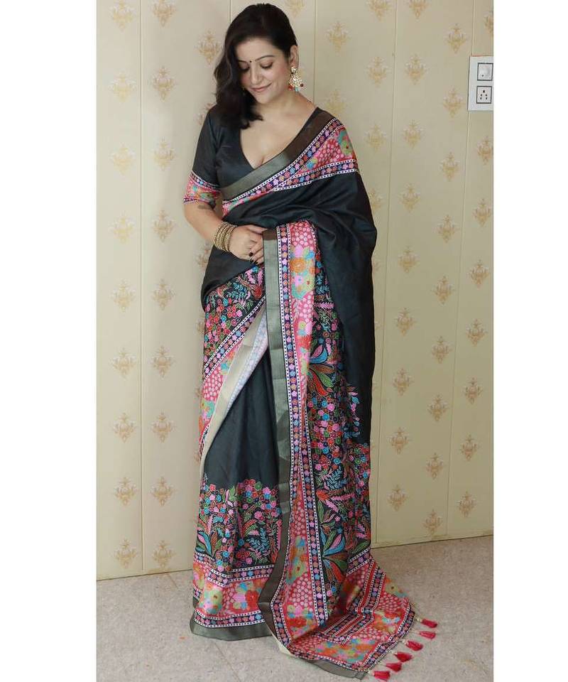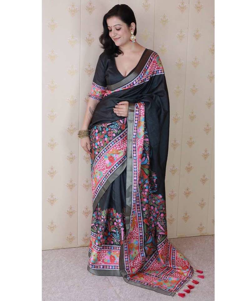 Black tussar art silk saree with unstiched blouse