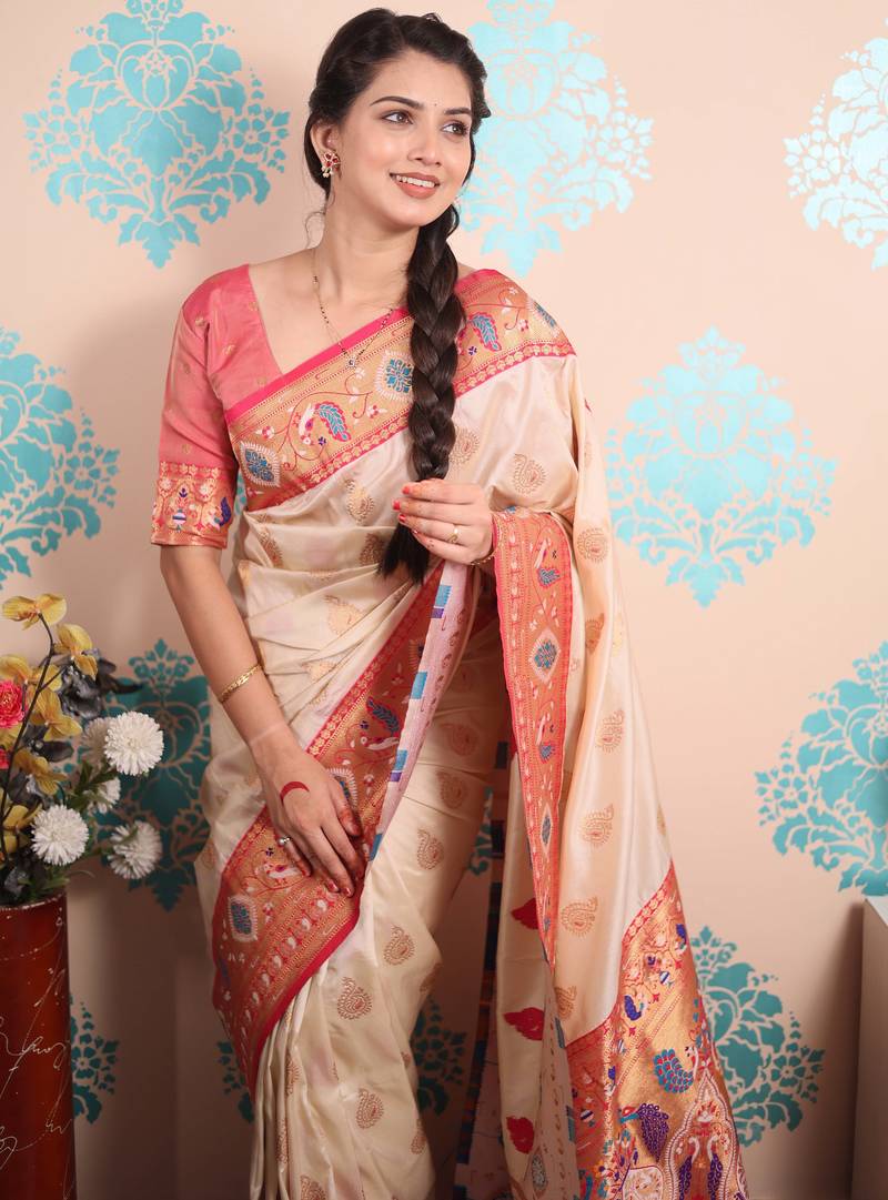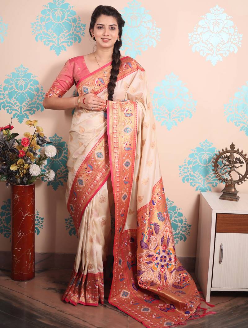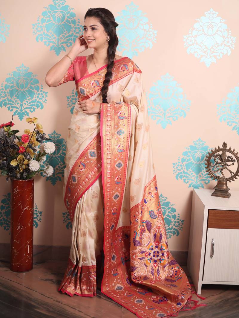 Cream paithani saree with unstiched blouse