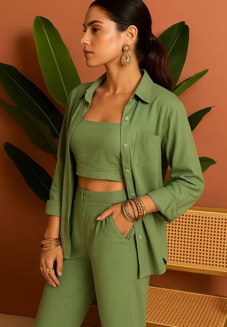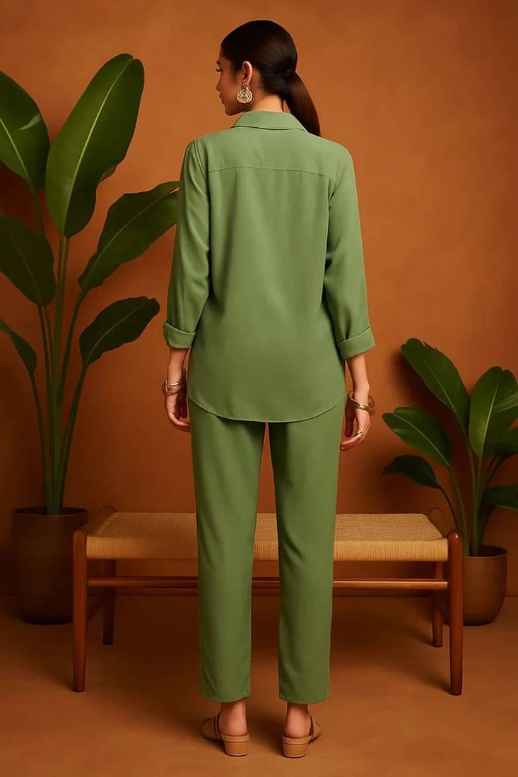Green blended cotton plain trendy co ord set