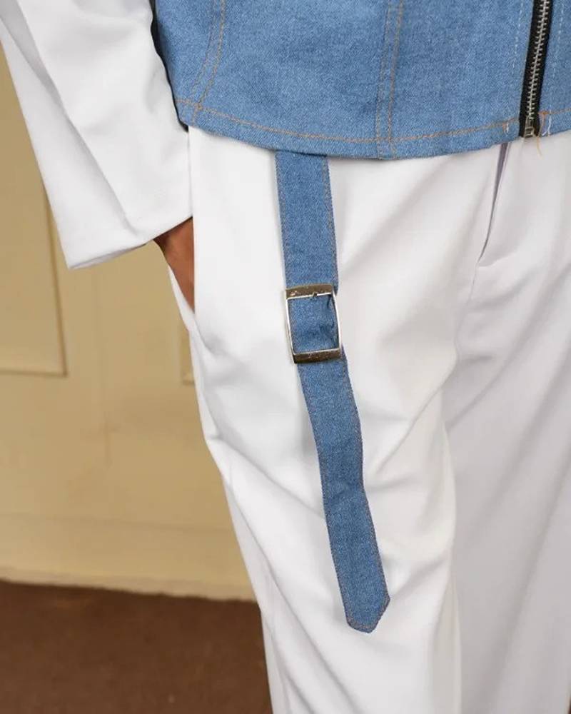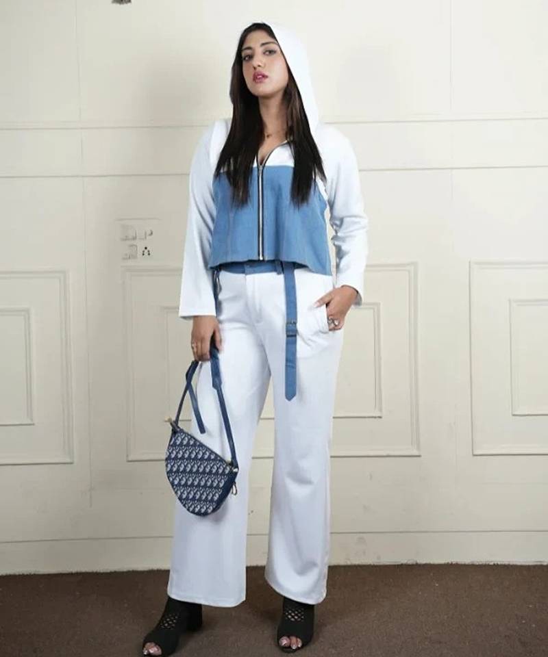 | Product Name | White Denim Blue Stretchable Fabric Zipper Free Size Co Ord Set | |