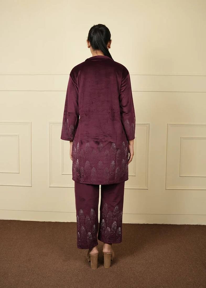 | Product Name | Wine Velvet Printed Velvet Long Jacket Set | |