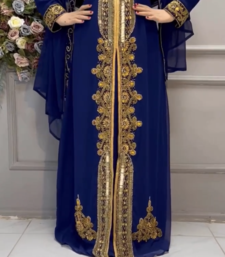 This Beautiful Royal Blue Kaftan Is Designed With Elegant Golden Embroidery That Gives A Rich And Stylish Look. The Front Panel Is Decorated With Detailed Thread And Sequence Work, Making The Outfit Perfect For Special Occasions. The Soft Georgette Fabric Makes It Comfortable To Wear For Long Hours, While The Matching Embroidered Belt Helps You Adjust The Fitting Easily.