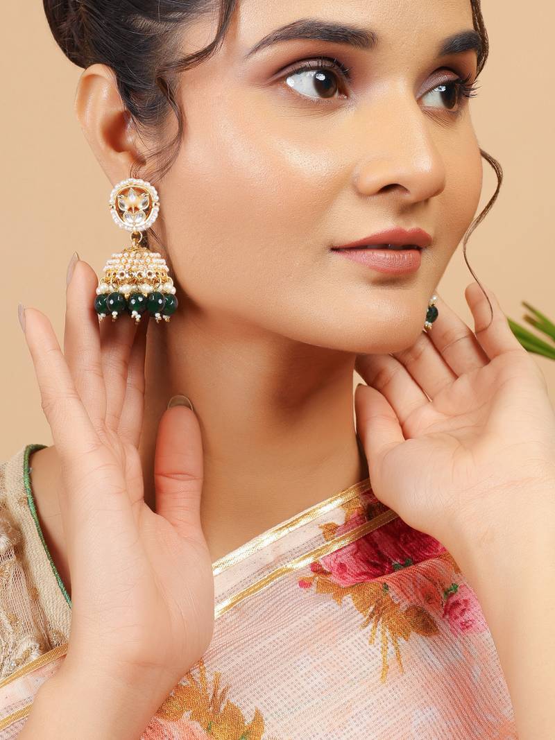 | Product Description | Gold Toned Kundan Jhumka Earrings Featuring A Classic Round Stud Top And A Traditional Bell Shaped Drop For A Timeless Ethnic Look. The Stud Is Set With Kundan Stones, While The Lower Jhumka Is Accented With Fine Pearl Detailing That Adds Subtle Shimmer. Multiple Green Bead Drops Add A Vibrant Contrast, Enhancing The Overall Richness Of The Design. The Reverse Side Of The Earrings Showcases Intricate Meenakari Enamel Work, Adding Elegance From Every Angle. |