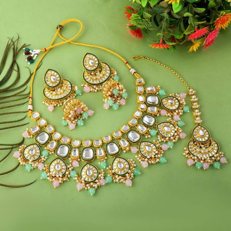 Product Description | Adjustable Rope | Necklace Length: 20.00 Cm X Width: 7.50 Cm | Earring Length: 9.50 Cm X Width: 4.00 Cm | Maang Tikka Length: 20.00 Cm X Width: 4.30 Cm | Metal: Alloy With Good Quality Gold Plated | Color: Pink & Pista Green | Stone: Kundan & Imitation Pearl | Package Content: 1 Piece Of Necklace/1 Pair Of Earring/1 Piece Of Maang Tikka | Gross Weight: 235.00 Grams | Back Finding: Post With Friction Back X Earring Style: Jhumka | Care Instruction : Avoid Heat & Chemicals Like Perfume, Deo, Alcohol, Etc. |