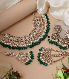 Product Description | Adjustable Rope | Necklace Length: 18.00 Cm X Width: 6.50 Cm | Earring Length: 8.00 Cm X Width: 3.00 Cm | Maang Tikka Length: 19.00 Cm X Width: 3.80 Cm | Maang Pasa Length: 16.00 Cm X Width: 6.80 Cm | Metal: Alloy With Good Quality Gold Plated | Color: Green | Stone: Kundan & Imitation Pearl | Gross Weight: 335.00 Grams | Package Content: 1 Piece Of Necklace/1 Pair Of Earring/1 Piece Of Maang Tikka/1 Piece Of Maang Pasa | Back Finding: Post With Friction Back X Earring Style: Jhumka |