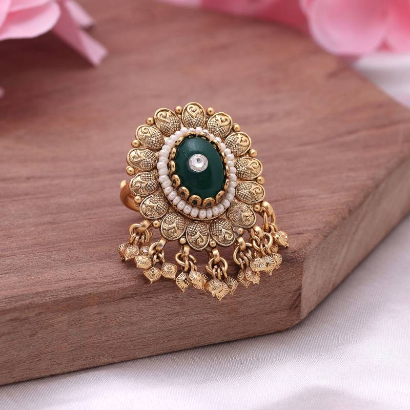 | Product Description | Ring Size: Adjustable | Diameter Length: 3.00 Cm X Width: 4.00 Cm | Metal: Alloy With Good Quality Gold Plated | Color: Green | Stone: Glass Stone | Gross Weight: 15.00 Grams | Package Content: 1 Piece Of Rings |