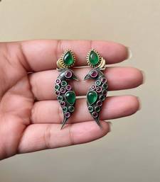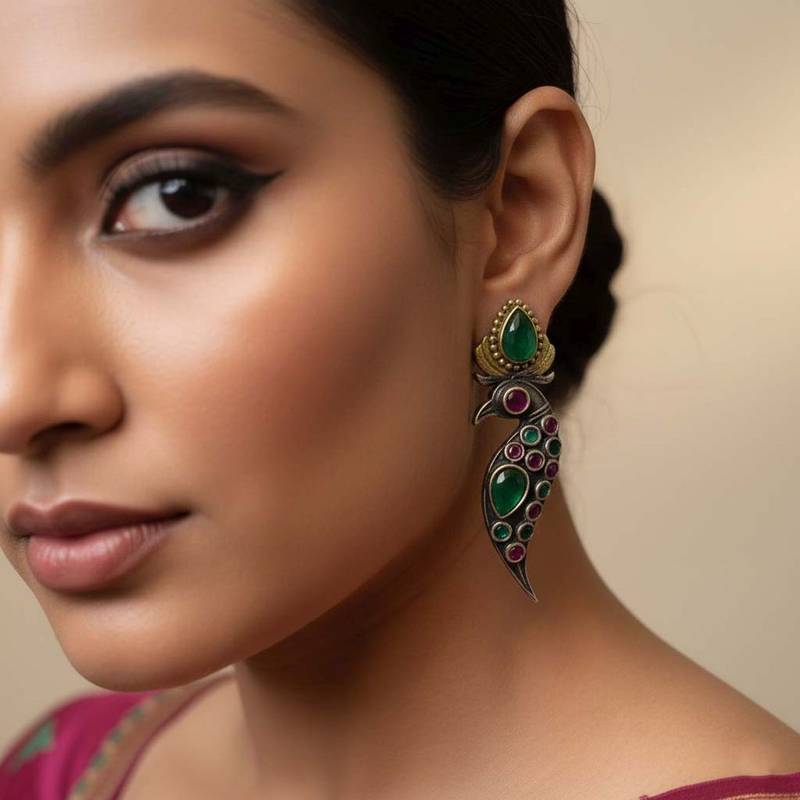 Green color oxidised earrings styled with dual-tone textures to enrich festive ethnic clothing