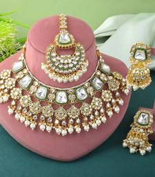 Product Description | Adjustable Rope | Necklace Length: 18.00 Cm X Width: 6.00 Cm | Earring Length: 7.00 Cm X Width: 3.00 Cm | Maang Tikka Length: 23.00 Cm X Width: 5.70 Cm | Metal: Alloy With Good Quality Gold Plated | Color: White | Stone: Kundan & Imitation Pearl | Package Content: 1 Piece Of Necklace/1 Pair Of Earring/1 Piece Of Maang Tikka | Gross Weight: 225.00 Grams | Back Finding: Post With Friction Back X Earring Style: Jhumka | Care Instruction : Avoid Heat & Chemicals Like Perfume, Deo, Alcohol, Etc. |