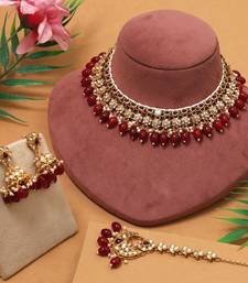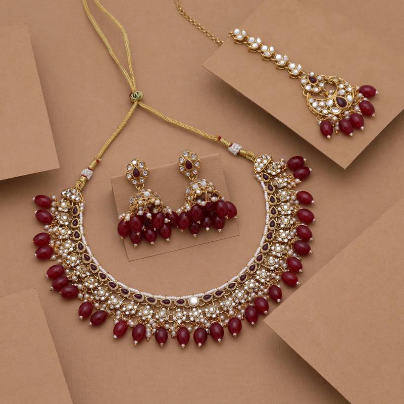 Product Description | Adjustable Rope | Necklace Length: 24.00 Cm X Width: 3.50 Cm | Earring Length: 5.50 Cm X Width: 2.50 Cm | Maang Tikka Length: 20.50 Cm X Width: 3.00 Cm | Metal: Alloy With Good Quality Gold Plated | Color: Maroon | Stone: Kundan & Imitation Pearl | Gross Weight: 143.00 Grams | Package Content: 1 Piece Of Necklace/1 Pair Of Earring/1 Piece Of Maang Tikka | Back Finding: Post With Friction Back X Earring Style: Jhumka |