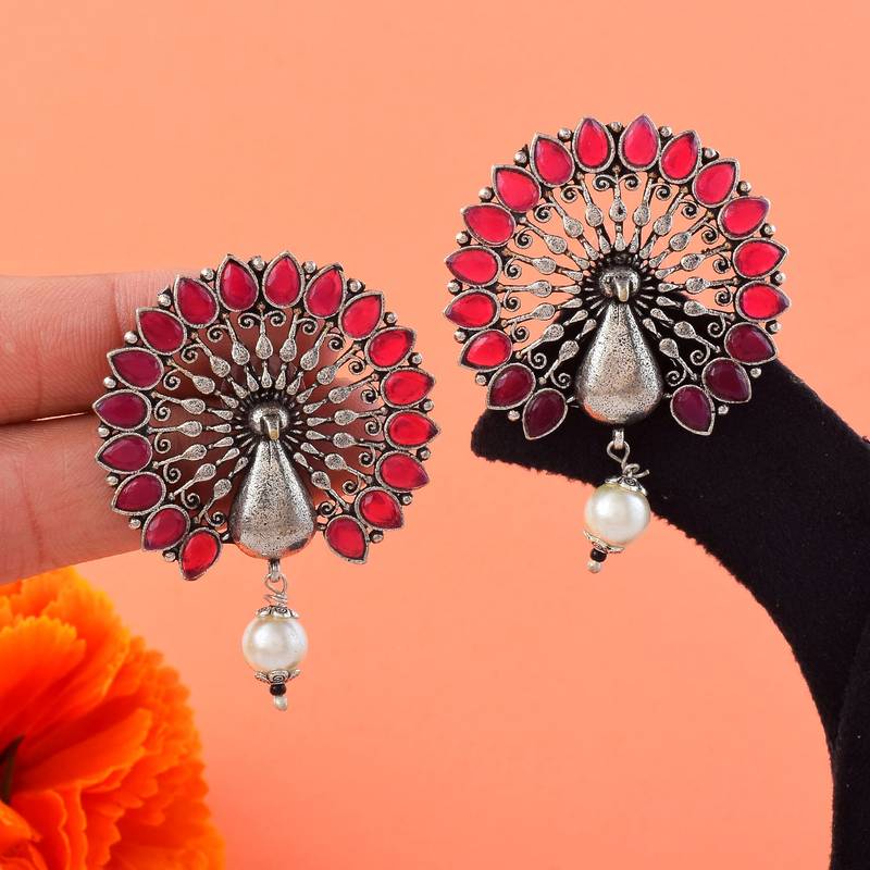 Product Description | Earring Length: 5.00 Cm X Width: 4.00 Cm | Metal: Brass With Good Quality Silver Plated | Color: Maroon | Stone: Glass Stone | Gross Weight: 22.00 Grams | Package Content: 1 Pair Of Earrings | Back Finding: Post With Friction Back X Earring Style: Dangle |